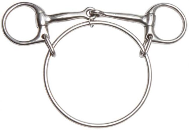 Stainless steel with single jointed mouth. Used mainly in flat racing for horses that lug. The large ring encircles the lower jaw to give the rider more control. This model features large links to the jaw ring, which allow the ring to slide more easily. It also includes a centre ring for a more direct action.